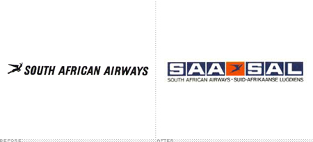 Durante muitos anos a companhia aérea utilizou dois nomes em seu logotipo: SOUTH AFRICAN AIRWAYS (SAA) e SUID-AFRIKAANSE LUGDIENS (SAL), este último escrito em africâner. O logotipo era representado por um antílope saltitante (chamado “springbok”). Na década de 1960 foi introduzido um novo logotipo contendo as cores nacionais (laranja, azul e branco), que continuou utilizando os dois nomes.