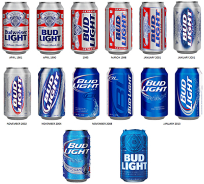 A tradicional lata da BUD LIGHT também passou por inúmeras mudanças de layout ao longo dos anos. Inicialmente prateada e vermelha, com detalhes azuis, ao longo dos anos, a lata adotou um visual mais moderno e jovial, incluindo a cor azul, a partir de 2008. A nova lata da BUD LIGHT foi apresentada no final de 2015 e adotou um design minimalista e mais limpo.